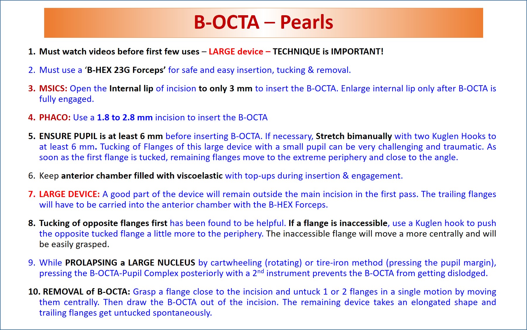 The extra-large pupil expansion provided by B-OCTA, facilitates the prolapse of the largest and hardest nucleus into the anterior chamber during MSICS. The unique design ensures firm engagement of B-OCTA to the pupil margin during
